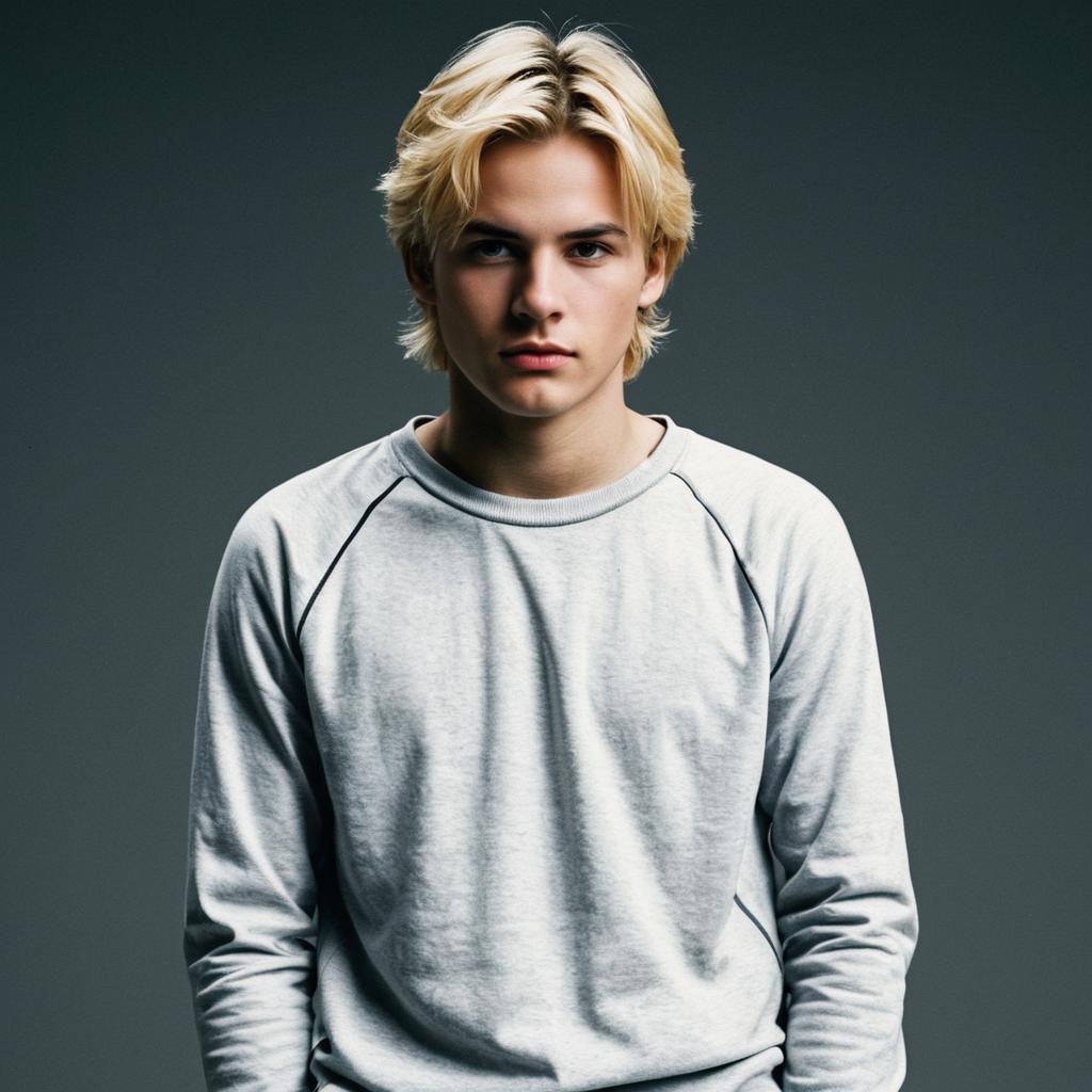Frat party halloween costume,male focus, jewelry, bracelet, 1boy, solo focus, realistic, necktie, shirt, necklace, looking at viewer, pants, blonde hair, blurry