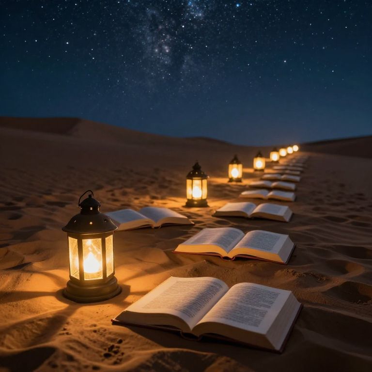 Photograph of a serene desert night scene under a starry sky. A row of open books lies on the sandy ground, illuminated by a series of glowing lanterns. The lanterns, positioned at regular intervals along the book line, cast a warm, yellow light, creating soft shadows on the sand. The Milky Way is visible in the dark blue sky above, adding a magical, cosmic feel to the scene. The lanterns and books stretch into the distance, creating a sense of depth and tranquility. The overall mood is peaceful and contemplative, combining natural beauty with a touch of mysticism.
