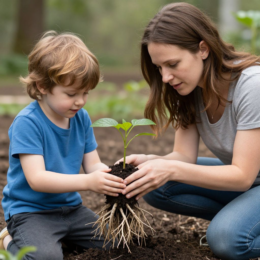 Photograph of a Caucasian mother with light brown hair, wearing a gray t-shirt and blue jeans, and a young boy with light brown hair, wearing a blue t-shirt and dark pants, kneeling in a garden. They are together planting a small green seedling in dark soil. The mother gently holds the soil with her right hand while the boy uses his left hand to support the seedling. The background is blurred with green foliage, indicating a forest or garden setting. The image conveys a sense of nurturing and family bonding.