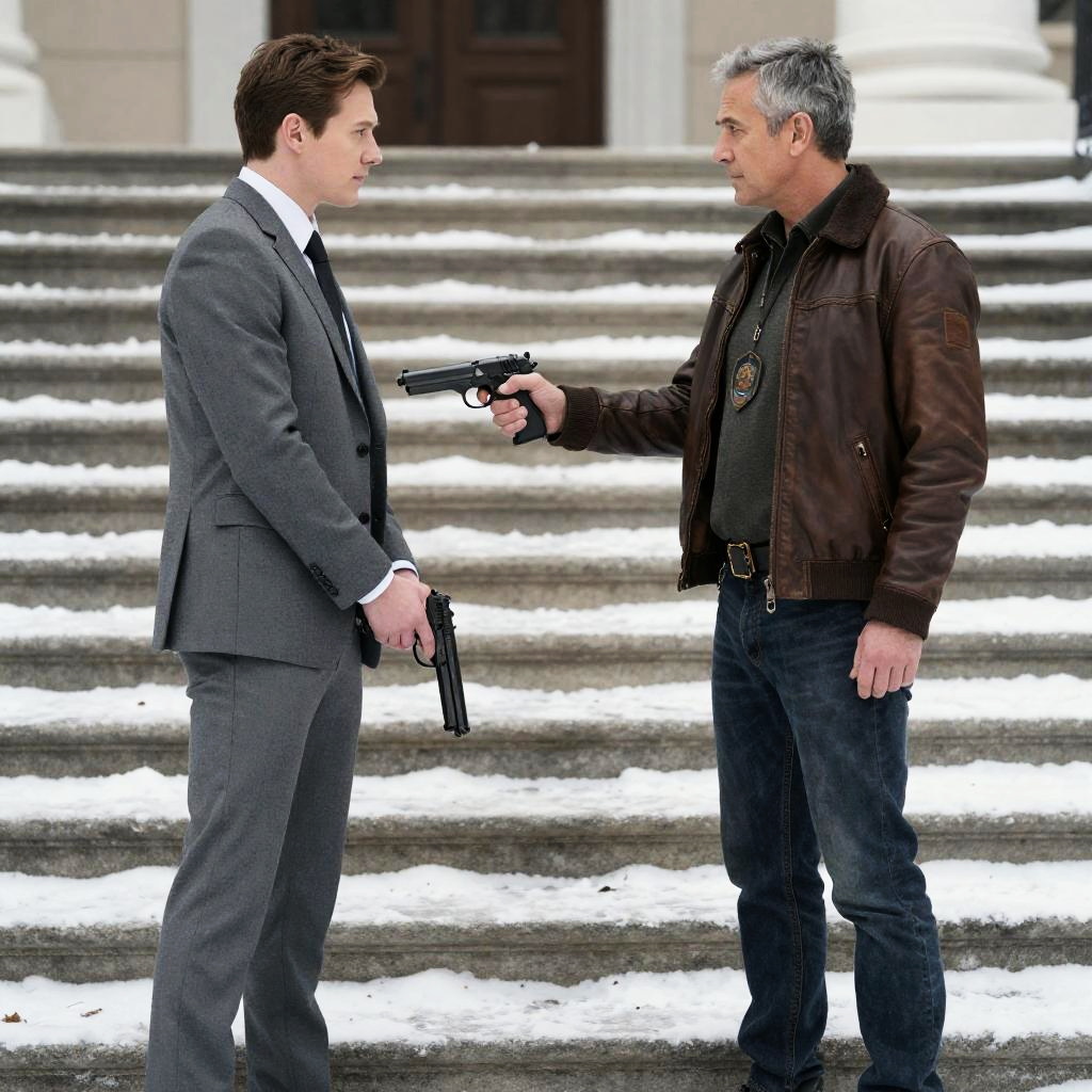 Photograph of two men standing side by side, both aiming pistols. Older man with gray hair in dark suit, younger man with brown hair in gray shirt. Both focused, arms extended forward. Background: brick wall and concrete ground. Sunlight.