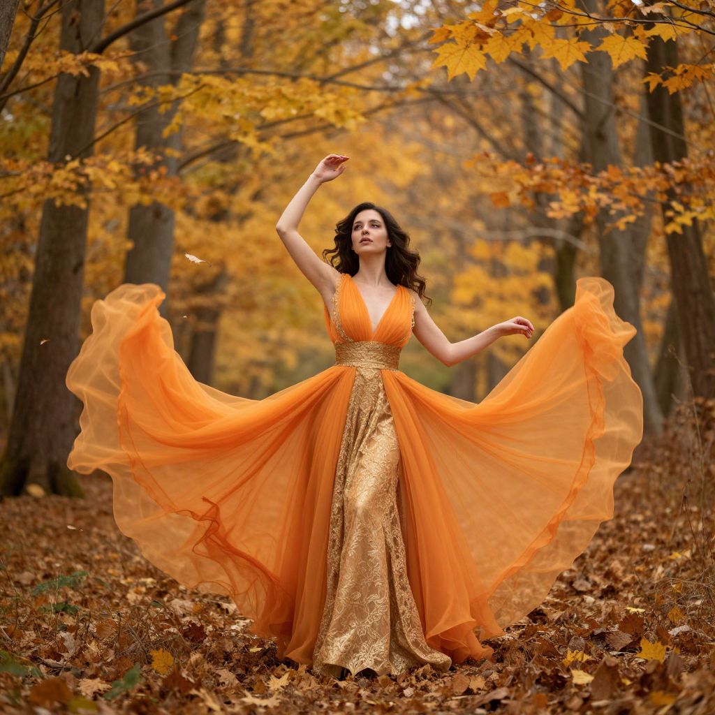 Photograph of a fair-skinned woman with long brown hair standing in a forest during autumn. She wears a sleeveless, floor-length, gold sequin gown with a plunging neckline, and a flowing, vibrant orange chiffon skirt that billows dramatically around her. Her right arm is raised above her head, and her left arm is extended to the side. The background features tall trees with orange and yellow leaves, and a forest floor covered in fallen leaves. The warm, golden light enhances the autumnal colors. The overall composition exudes a sense of elegance and movement.