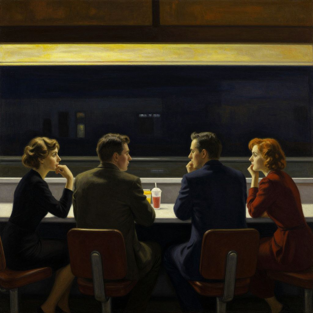 Nighthawks by Edward Hopper, 1942, depicts four individuals seated at a diner counter under warm artificial light, with two men facing each other while a man and woman sit across from them, all engaged in quiet conversation, framed by the stark contrast of the dark night outside.