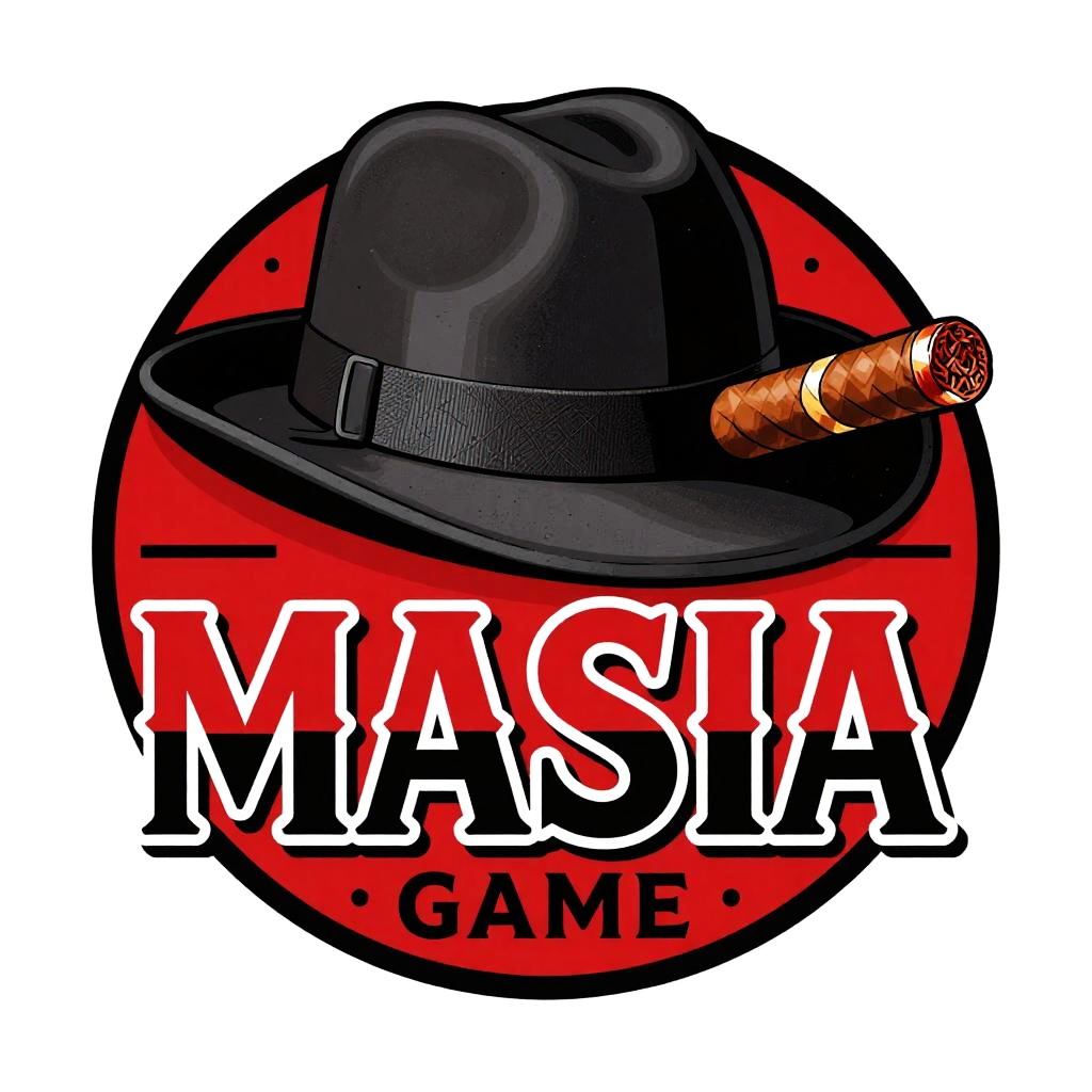 Mafia game logo featuring a classic fedora hat and cigar, bold red and black color scheme, gritty texture, art deco fonts, dramatic shadows, 1920s gangster vibe