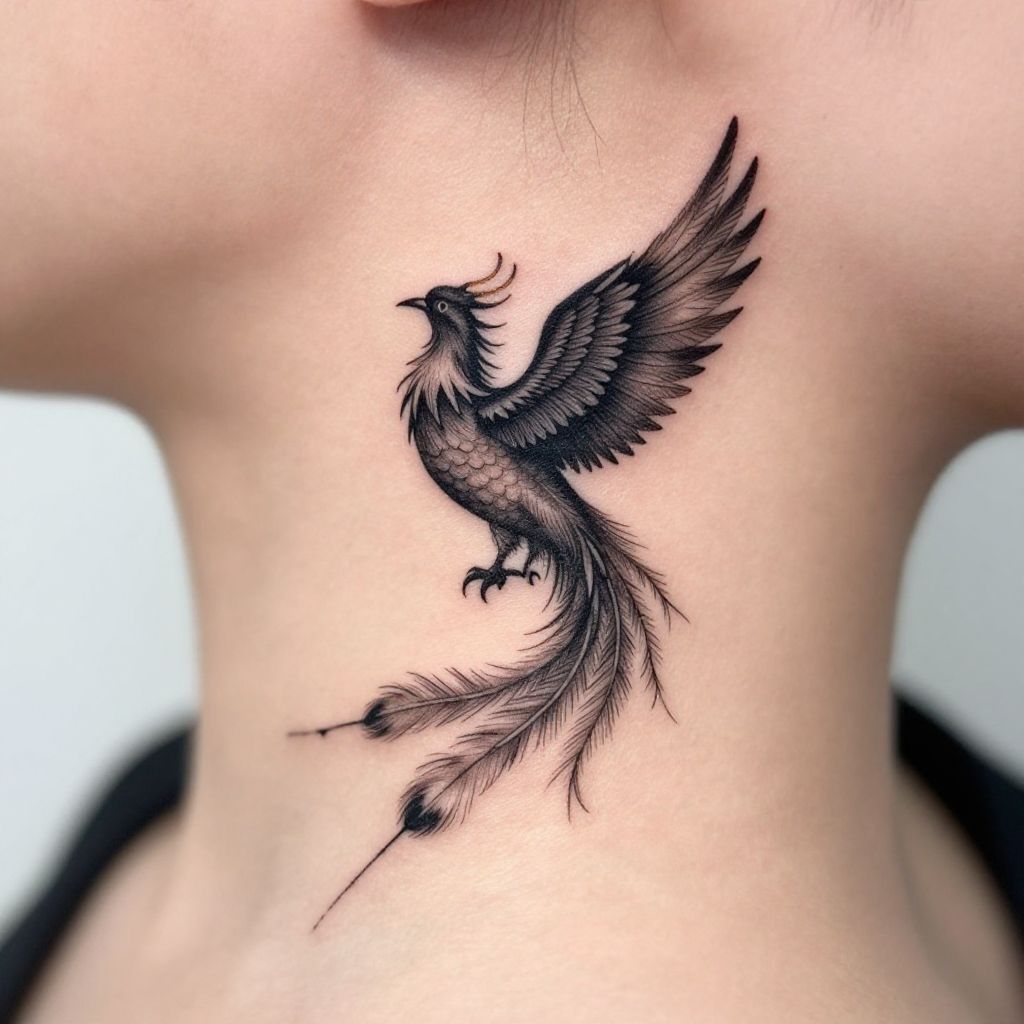 Photograph of a detailed black ink phoenix tattoo on the side of a pale neck, featuring feathery wings and tail.