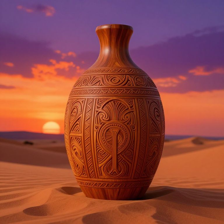 Urna carved from warm oak wood with elaborate tribal patterns and detailed engravings, surrounded by desert sands at sunset, dramatic sky with hues of orange and purple, evocative of ancient rituals and deep cultural heritage, painterly style.