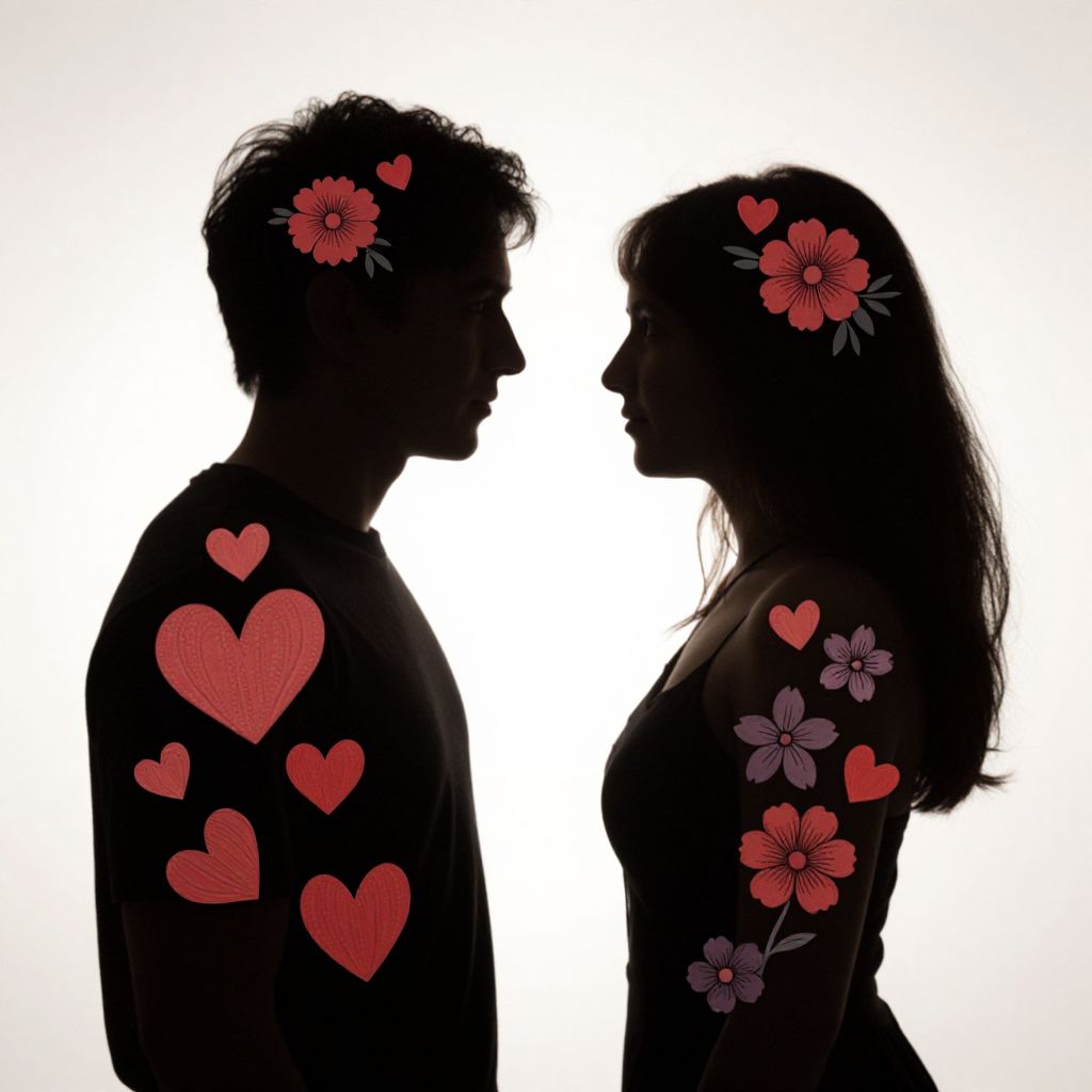 Two silhouettes of a man and woman facing each other, adorned with hearts and flowers, symbolizing love.