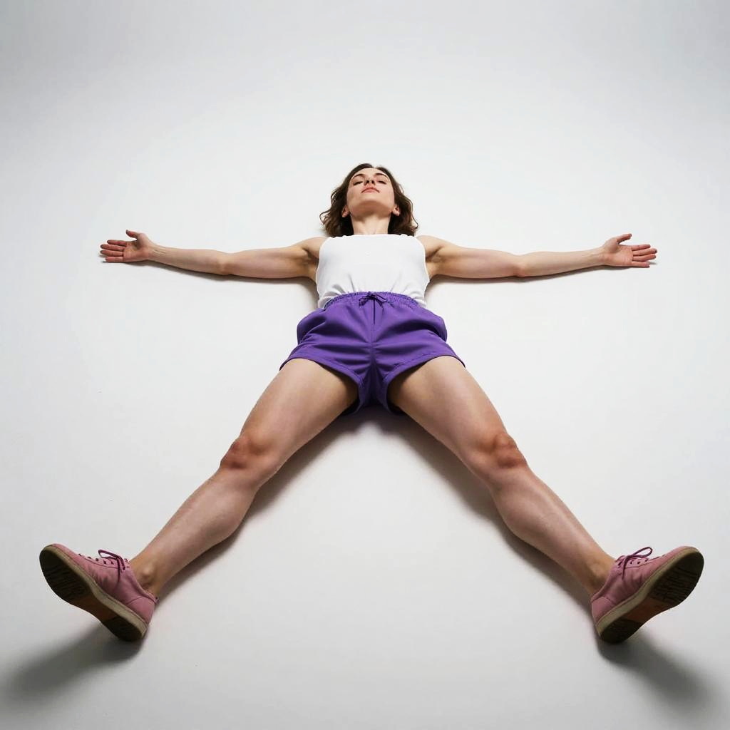 Photograph of a woman lying on her back against a white background. She has short brown hair and is wearing a white top, purple shorts, and pink shoes. Her arms are outstretched to the sides, and her legs are spread apart. The image is highly lit, creating a stark contrast with the white background. The overall composition is minimalist and dramatic.