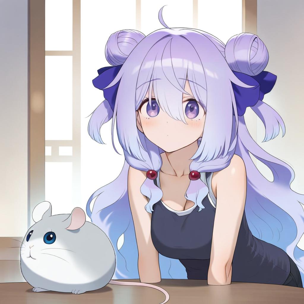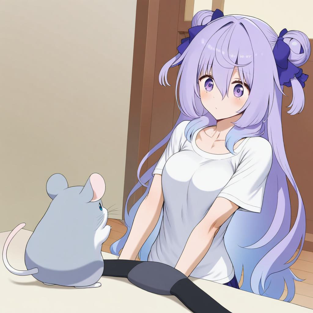 Amamiya shizuku (hizuki yayoi), original, 1girl, hair between eyes, blue eyes, purple eyes, purple hair, very long hair, blue hair, two side up, double bun, hair bow, medium breasts, collarbone, white shirt, blue bow, chinchilla (animal), animal, by artist wata do chinkuru, animagine