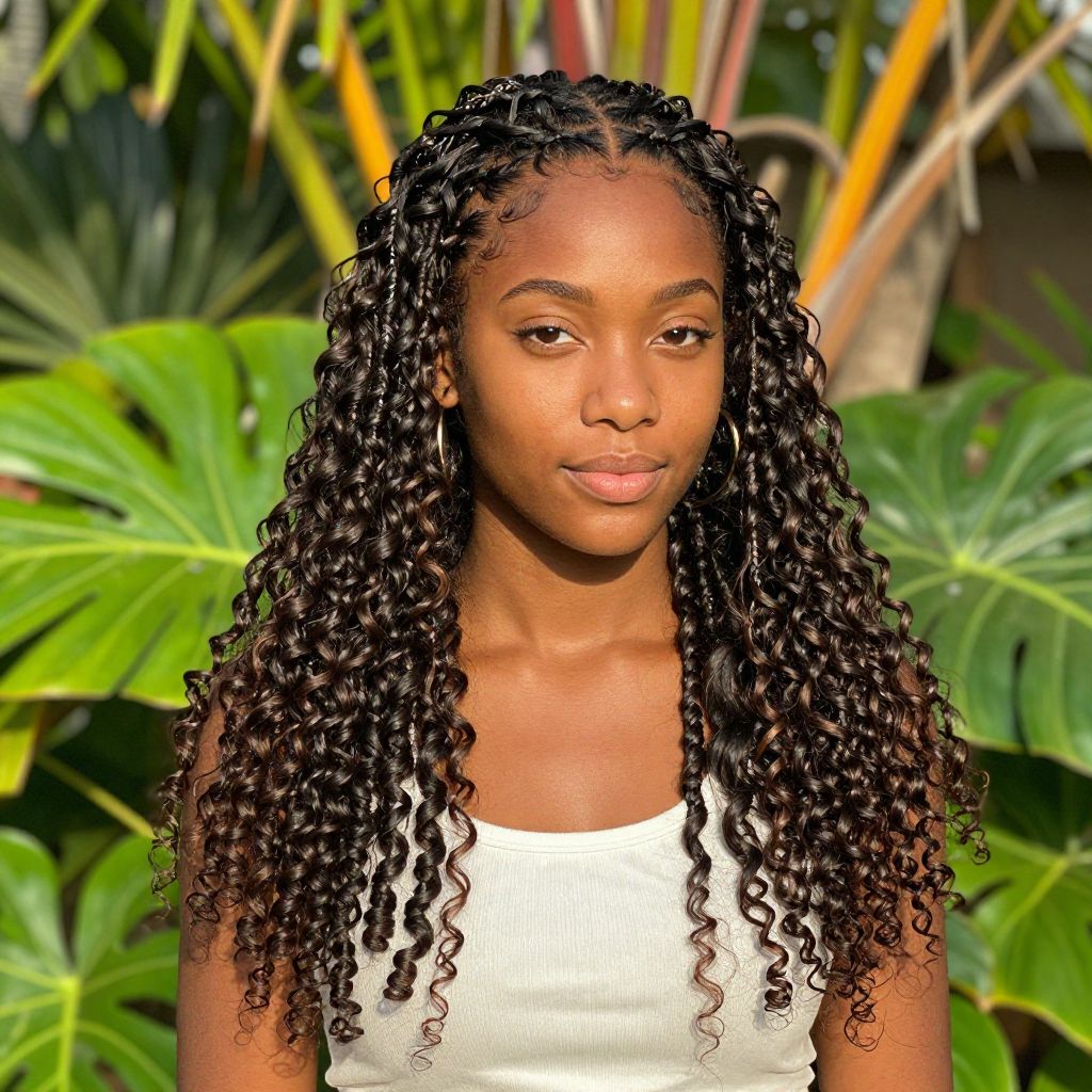 Black girl locks cascading down her shoulders, glowing under soft sunlight, surrounded by lush tropical foliage, vibrant colors, detailed textures, warm and inviting atmosphere, portrait style with focus on natural beauty and intricate hair patterns.