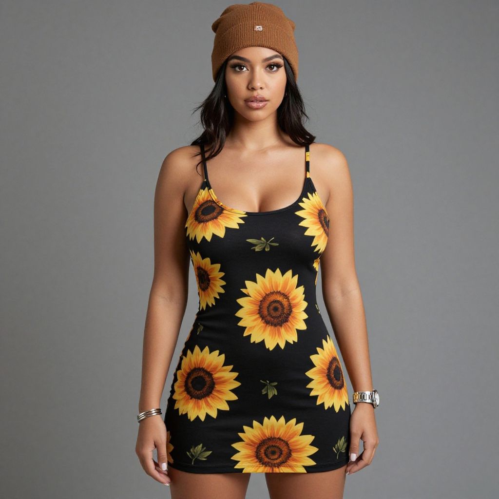 "Woman, casual streetwear, sleeveless mini dress in black with vibrant sunflower print, scoop neckline, thin spaghetti straps, relaxed fit, accessorized with a brown knit beanie, silver watch on left wrist, stacked silver bangle bracelets on right wrist, solid grey background. Sexy. Pretty face and beаutiful eyes. Big breasts."