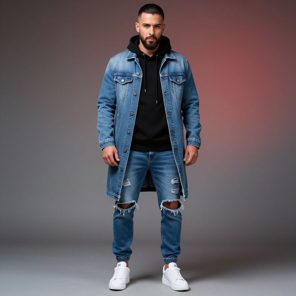A stylish man stands confidently wearing a layered outfit featuring a long denim jacket over a black hoodie paired with ripped denim jogger pants and white sneakers. The modern urban look is enhanced by his well-groomed beard and slicked-back hair, set against a subtle gradient background emphasizing contemporary street fashion.