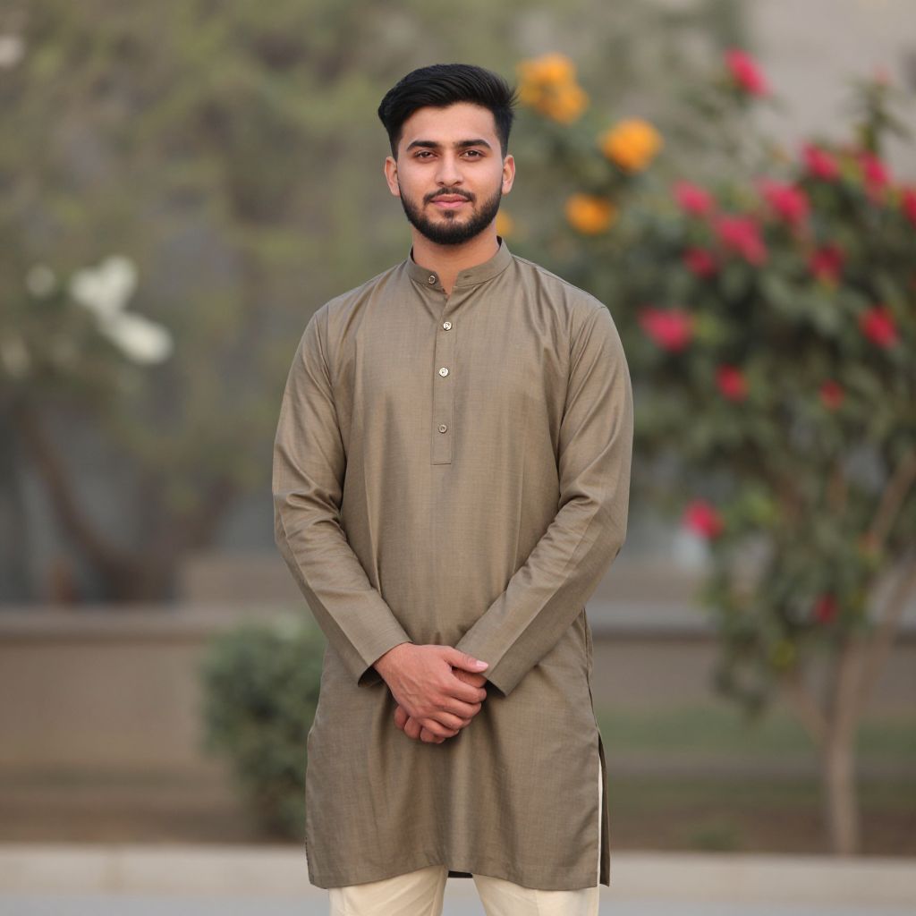 Photograph of a young South Asian man with dark hair and beard, wearing a beige traditional long kurta, standing outdoors with hands clasped, blurred
