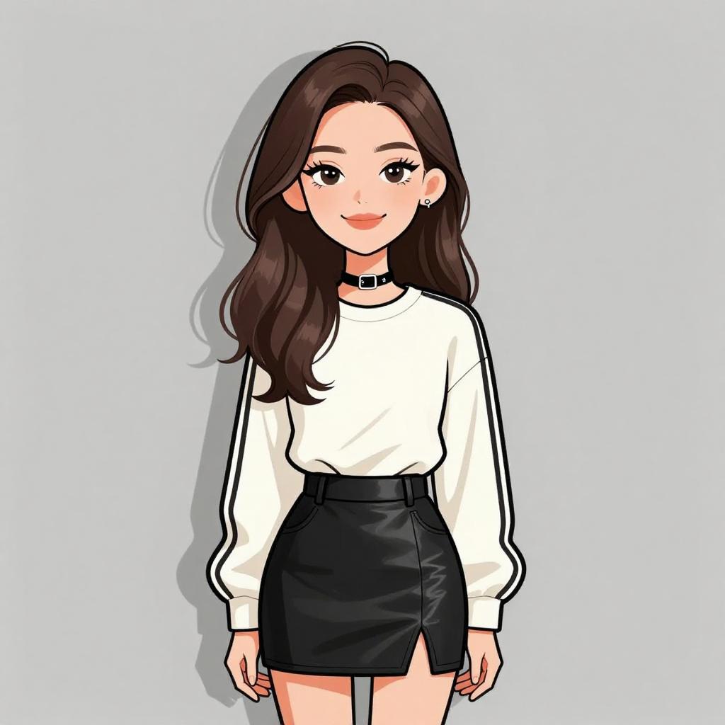 Woman with pretty face and pretty hair. smiling Woman, edgy, white crewneck sweatshirt with black stripe pattern on sleeves, black leather mini skirt, flared silhouette, choker necklace with metal details. --sref 1467