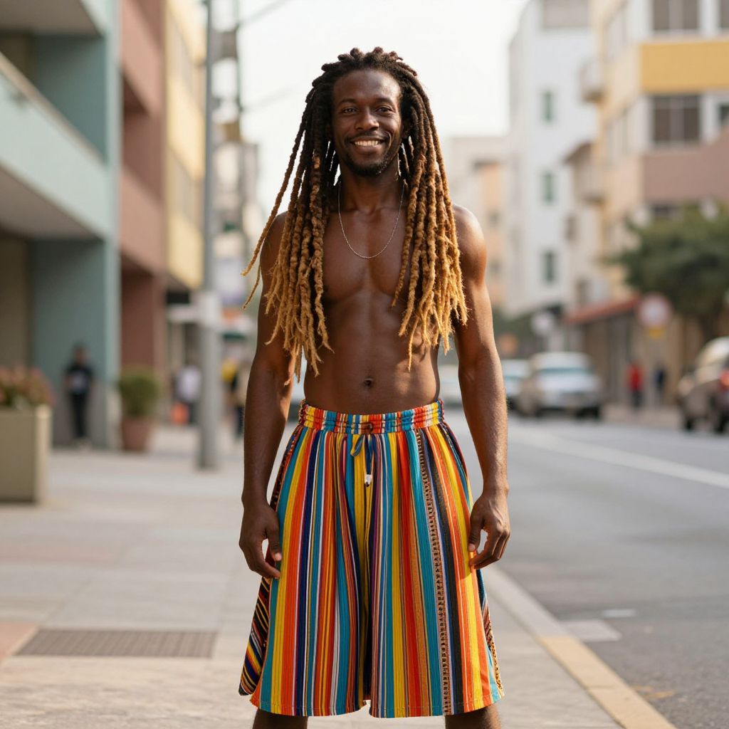 A man with vibrant, flowing dreadlocks stands confidently in a modern urban setting, wearing a bold, bright-colored striped skirt that contrasts with his natural hair and masculine appearance. The scene is sunlit with soft golden hues, and he smiles warmly, exuding strength, style, and individuality. The background features a cityscape with colorful buildings and a subtle hint of movement, emphasizing his unique blend of tradition and modernity.