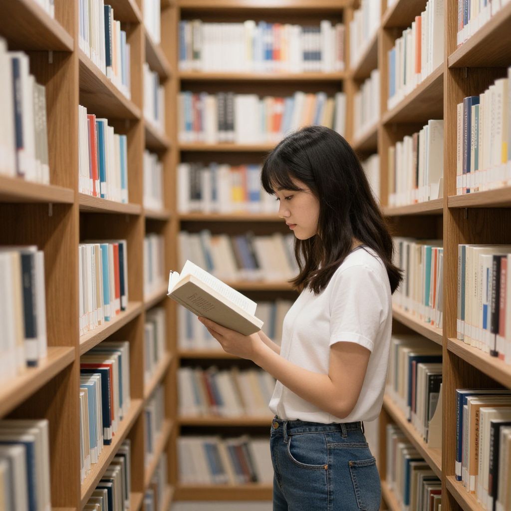 Photograph of an Asian woman with black hair, wearing a white t-shirt and blue jeans, reading a book in a wooden library aisle filled with book