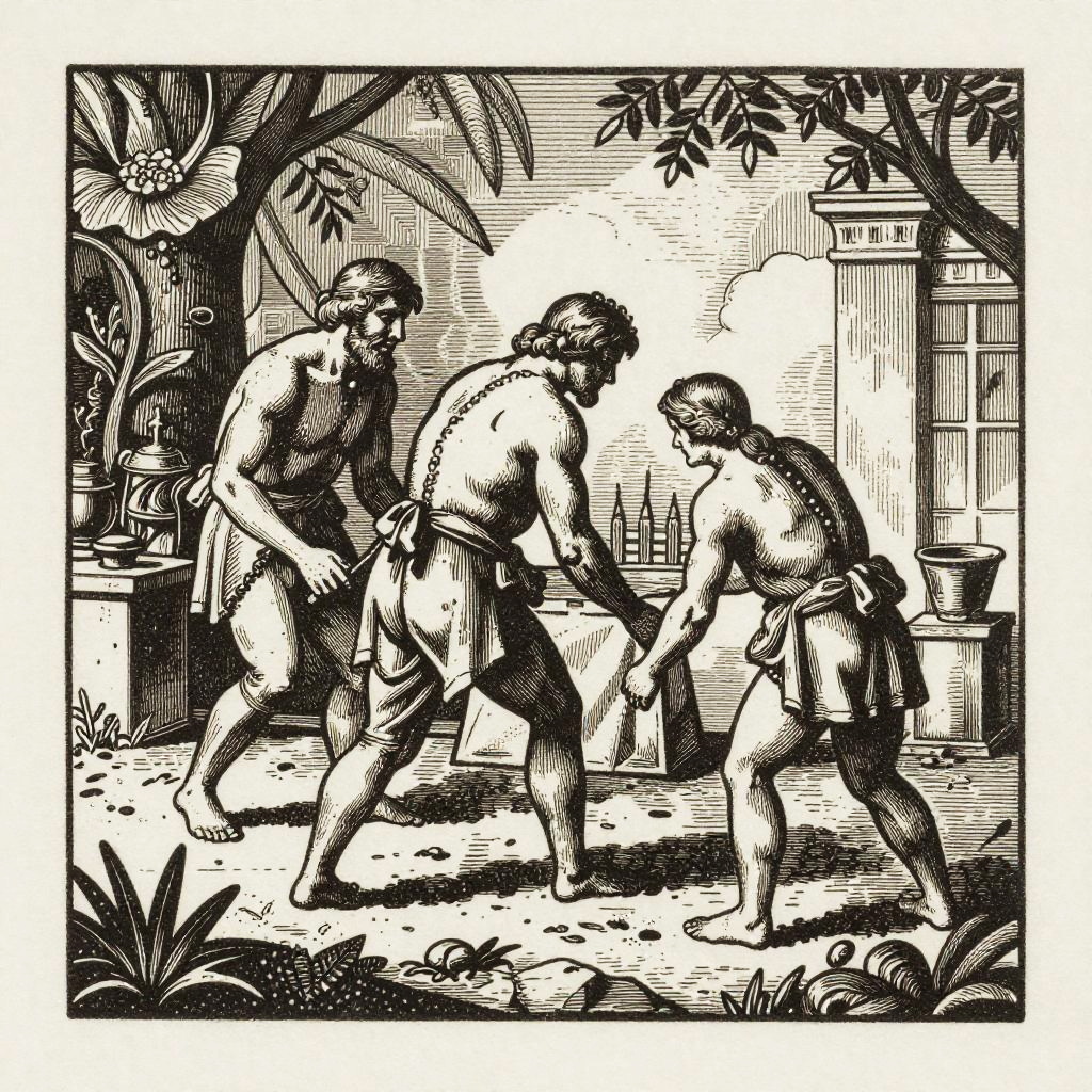 Grabados art style depicting intricate linework and textures, showcasing a vintage, classical scene with meticulous details in black and white, reminiscent of traditional woodcut prints with dramatic shadows and depth.