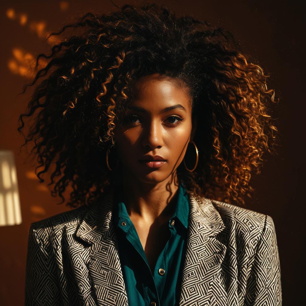 Close-up portrait of an African descent woman with voluminous curly hair and warm glowing skin. She wears a patterned structured jacket over a collared teal shirt and large hoop earrings. The image features chiaroscuro lighting with ambient morning light casting soft shadows on her face, highlighting her deep clear eyes and sculpted features, set against a dark arabesque-inspired backdrop.