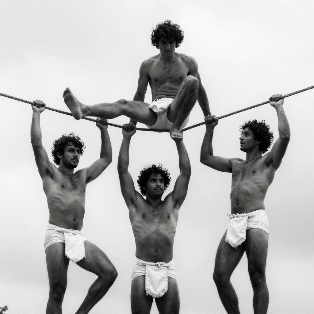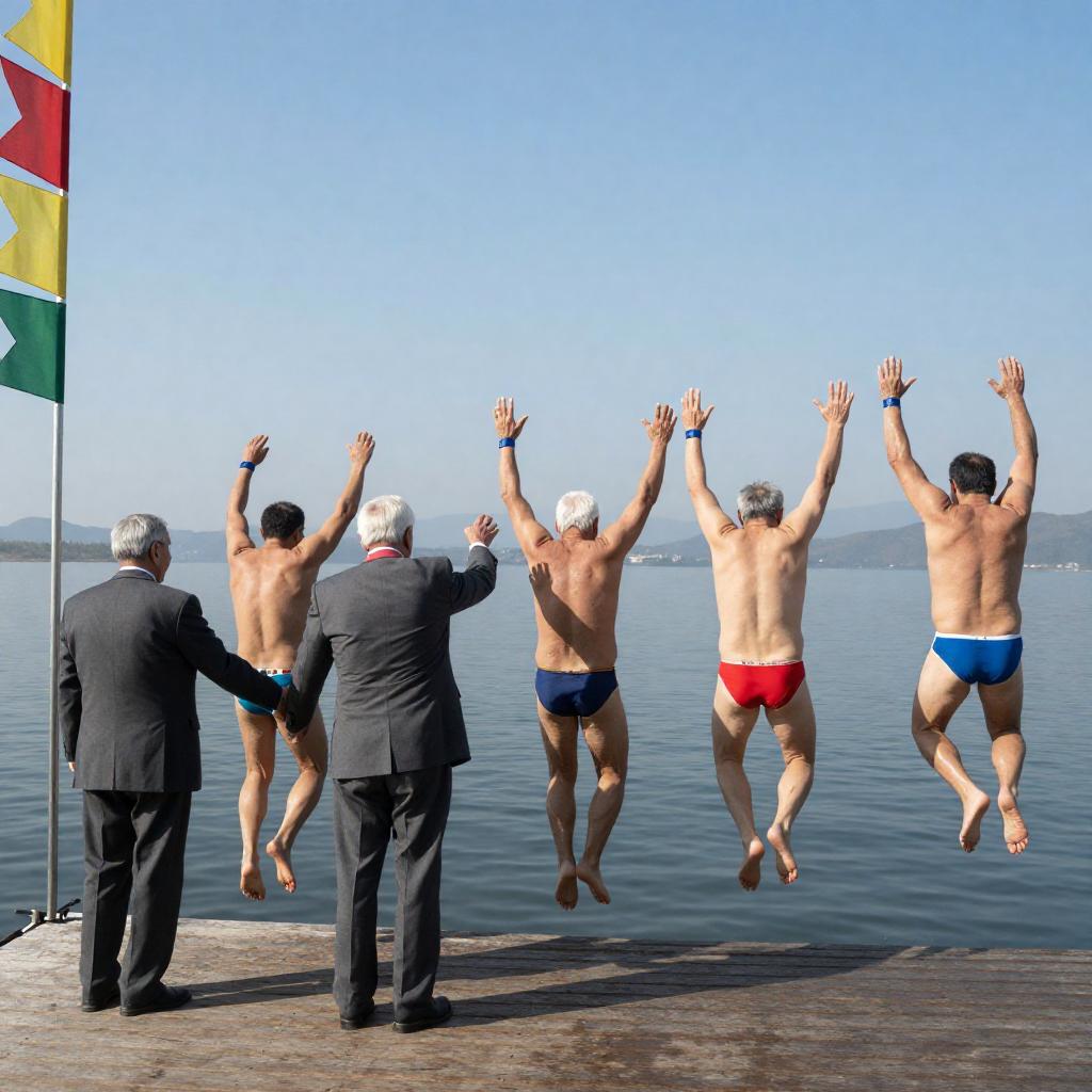 Photograph of elderly men in suits, one with a red tie, standing on a wooden dock. Six shirtless men in colorful briefs and armbands raise arms and jump into the lake. Colorful flags above. Clear sky, distant hills. Men in suits clasp hands with jumping men. Bright sunlight.