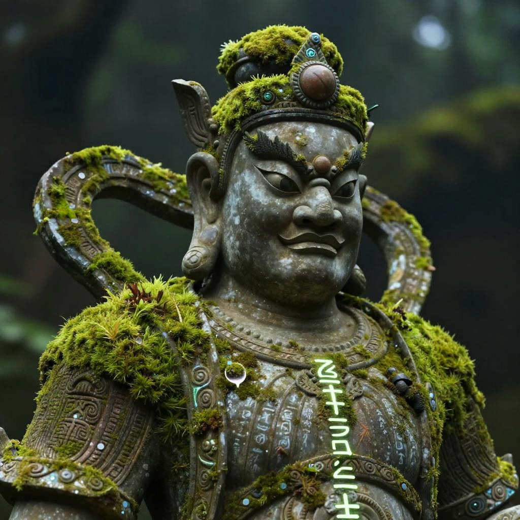 Realistic photo.A detailed rendering of an ancient guardian statue, covered in moss and glowing runes. The artwork blends realism and surrealism, featuring a serene atmosphere, soft and mystical lighting, with ethereal and otherworldly details. realistic photo