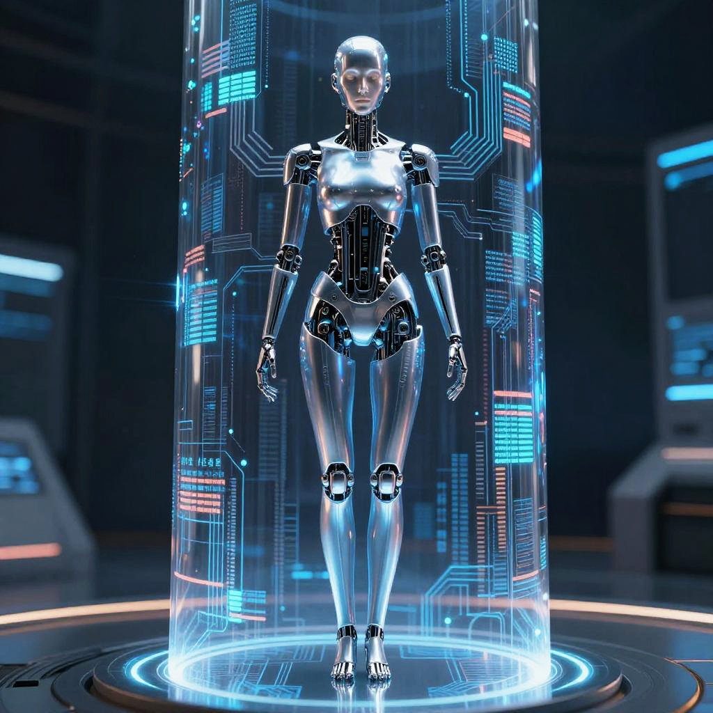 CGI image of a futuristic, neon-lit, silver and black humanoid robot with glowing blue eyes, displaying "AI NZE" in white neon