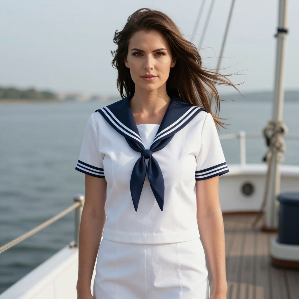 Sailor woman stands confidently on a ship's deck, wearing a crisp white uniform with navy accents, her brown hair flowing gracefully in the breeze as she gazes directly at the camera against a serene waterfront backdrop.