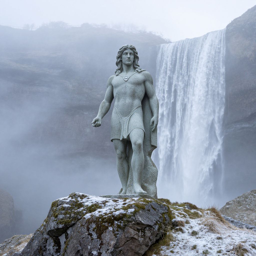 Two colossal stone titans sit eternally poised, their silent confrontation echoing the primal struggle between creation and destruction, as the valley below breathes with the rhythm of their unspoken dialogue.