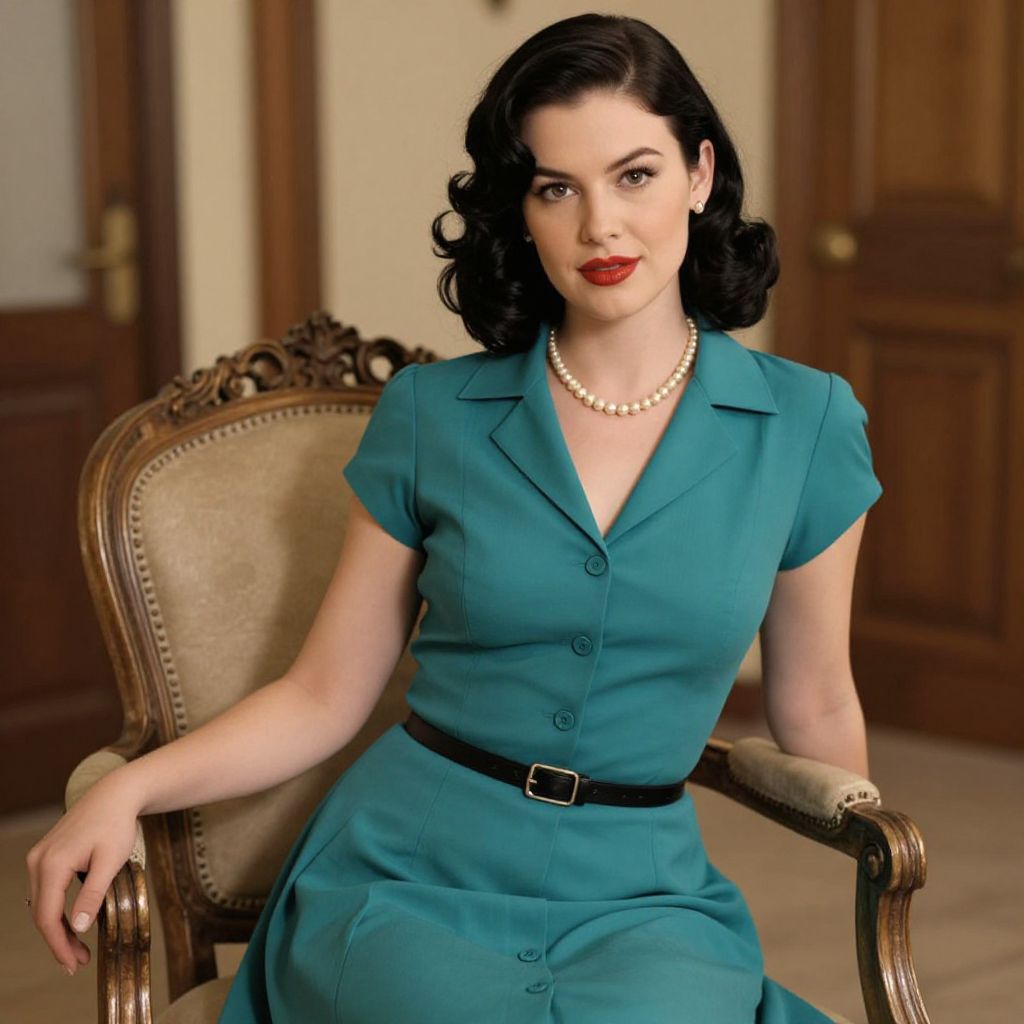 A vintage-style photograph of a woman with fair skin and dark, wavy hair sitting on an ornate wooden chair with a beige cushion. She's wearing a teal, short-sleeved, V-neck dress that's buttoned down the front, a pearl necklace, and a black belt. She has red lipstick and a confident, slightly smiling expression. The background is softly lit with warm tones and wooden doors.