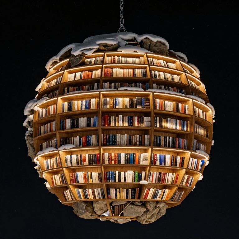 Photograph of a spherical light fixture filled with illuminated bookshelves, surrounded by snow-covered rocks, hanging against a black background.