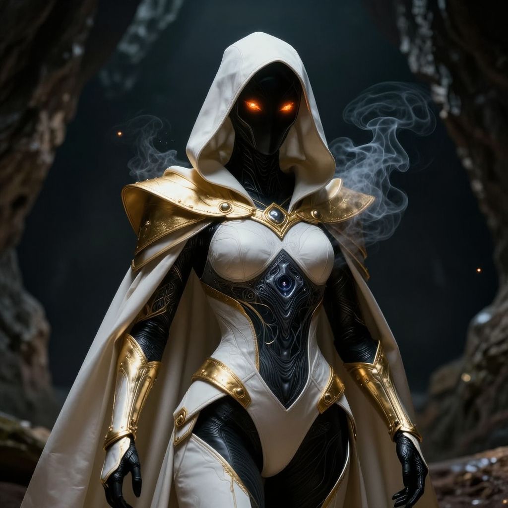 A digital artwork depicts a dark-skinned, glowing orange-eyed female figure with a black face, wearing a white hooded cloak with gold trim over a form-fitting white and black armor. Her armor features intricate gold patterns and her breasts are prominently emphasized. Smoke or mist swirls around her, adding a mystical aura. The background is a dark, rocky cavern. The image has a fantasy, gothic style with high contrast and dramatic lighting, emphasizing the character's otherworldly appearance.
