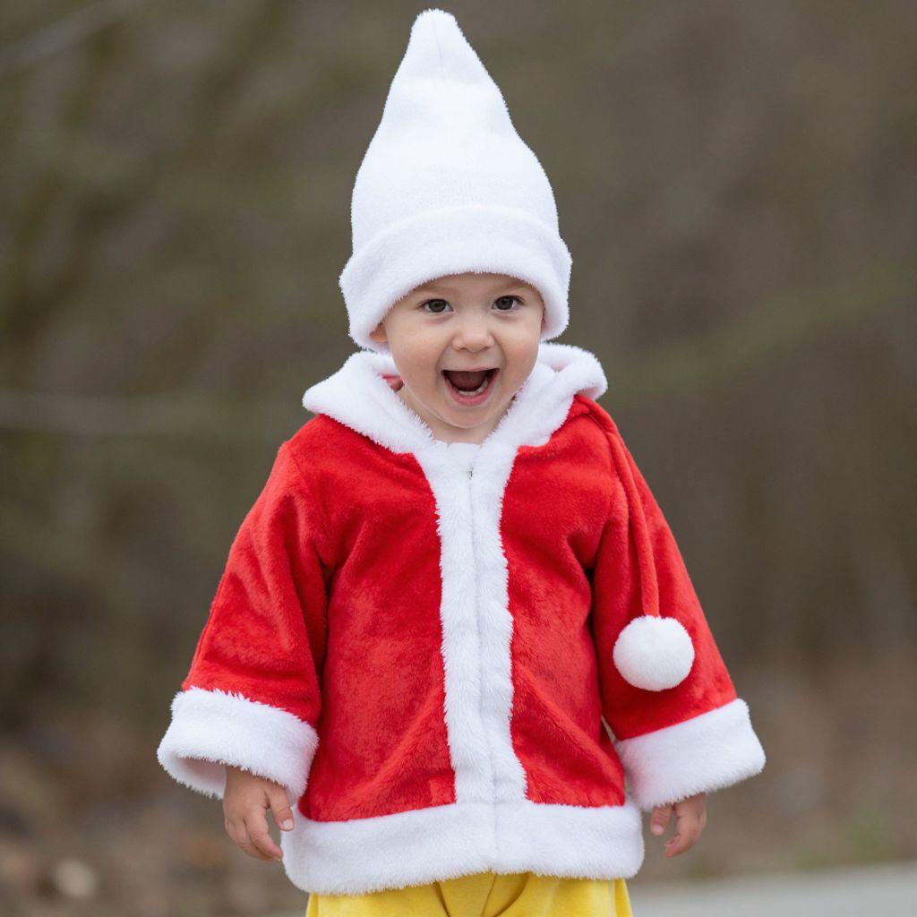 Photograph of a smiling toddler in a red Santa jacket with white trim, yellow pants, and a white Santa hat, standing outdoors against a blurred forest