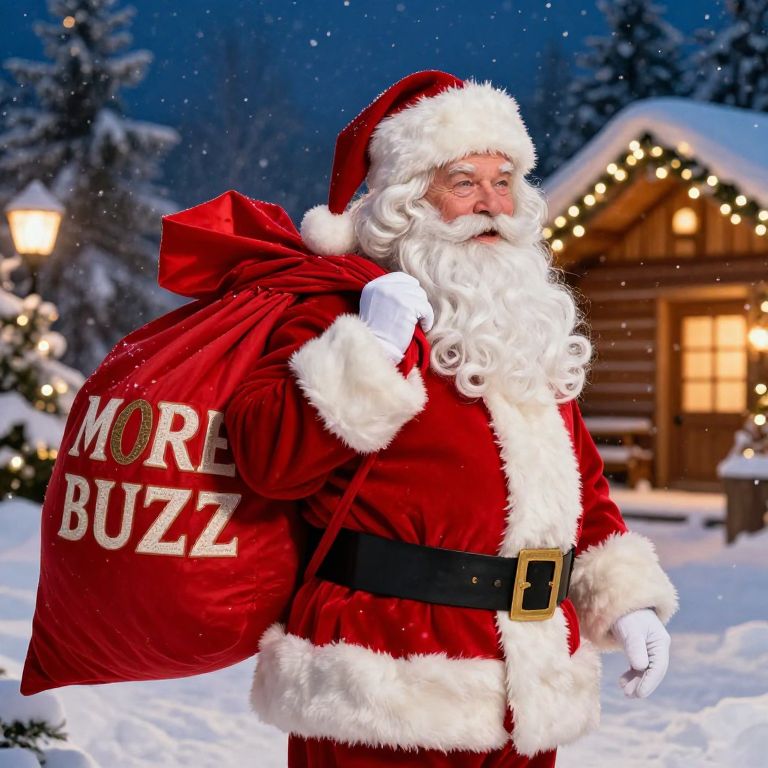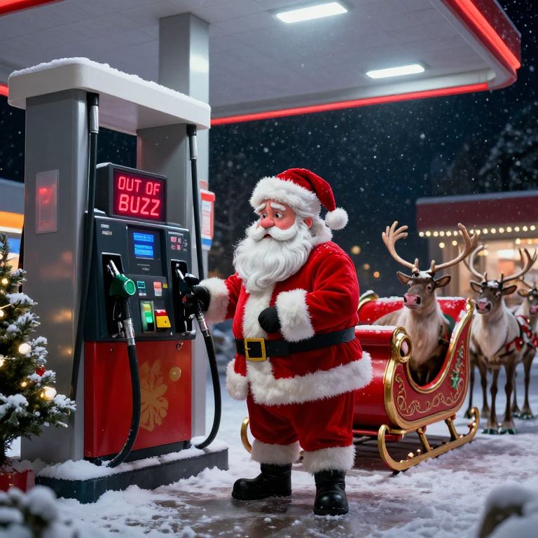 Aidmafluxproultra, mythp0rt A humorous and whimsical digital artwork featuring Santa Claus at a modern gas station late at night, trying to refuel his magical sleigh, Santa, a jolly, round figure with a long white beard and his signature red suit trimmed with white fur, looks perplexed as he holds a gas pump nozzle, The pump has a large, glowing digital screen displaying the message \"OUT OF BUZZ\" in bold red letters, adding a playful and ironic twist, The sleigh, painted in vibrant red and gold with intricate Christmas-themed decorations, is parked next to the pump, It is attached to a team of tired, confused reindeer waiting patiently, The gas station is dimly lit with a mix of fluorescent lights and the warm glow of holiday decorations, including string lights and a small Christmas tree near the pump, The setting is snowy, with a light flurry falling, creating a cozy yet humorous winter scene, Santa's expression is a mix of frustration and disbelief, while one reindeer glances at the pump with a raised eyebrow, The artwork is rich in detail, from the texture of the snow to the reflections on the sleigh, capturing a lighthearted and festive mood