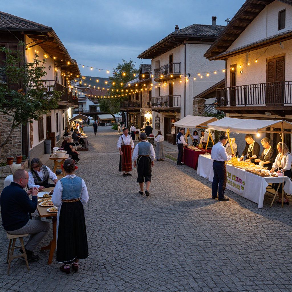 This photograph captures a quaint, cobblestone street in a European village during twilight. Warm, string lights hang between charming, white-walled buildings with wooden balconies and tiled roofs. On the right, market stalls with white canopies display glowing candles and handicrafts. People, dressed in traditional attire—men in shirts and vests, women in skirts and aprons—sit at tables on the left, enjoying meals. A couple walks down the center, adding a sense of movement. The sky is a deep blue, enhancing the cozy, rustic atmosphere. The street is lined with trees and more buildings in the background.