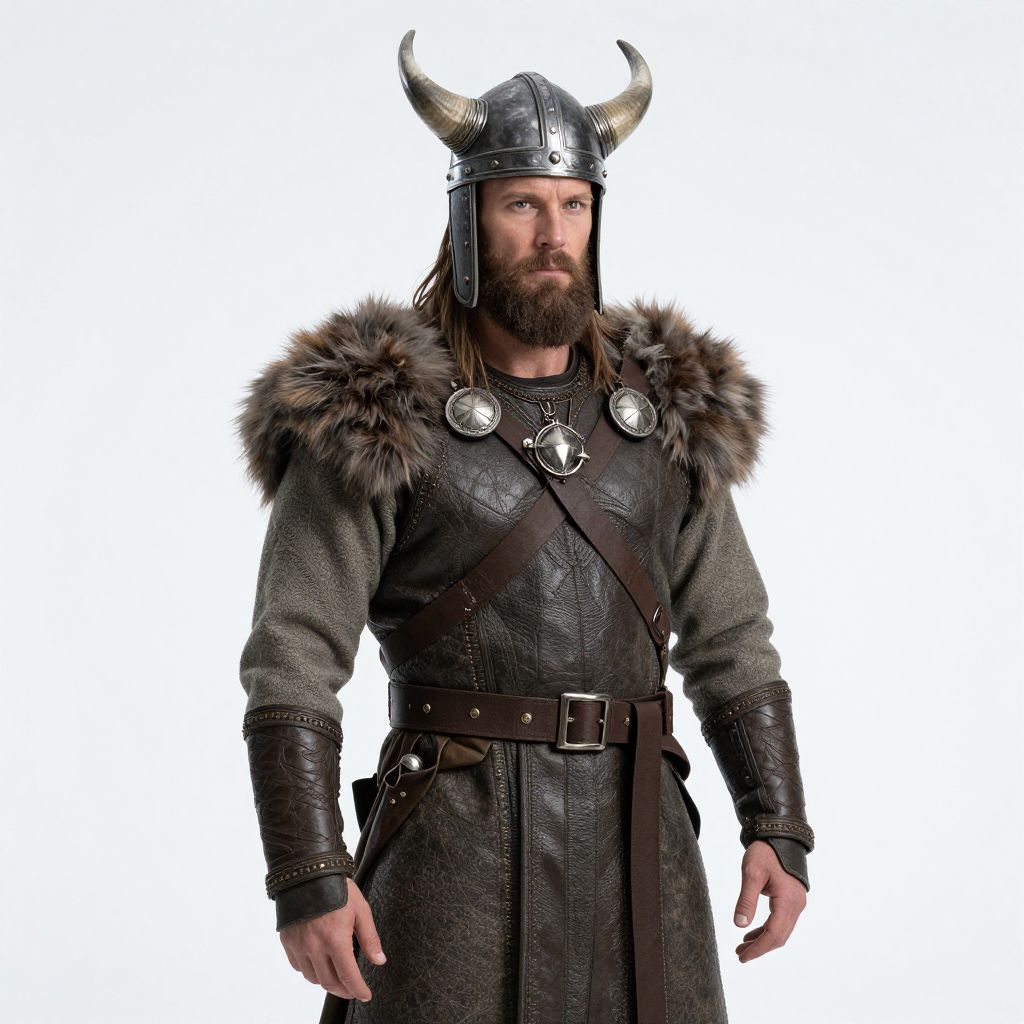 Photograph of a muscular bearded man in Viking armor: metallic helmet with horns, fur-trimmed leather tunic, silver brooch, brown