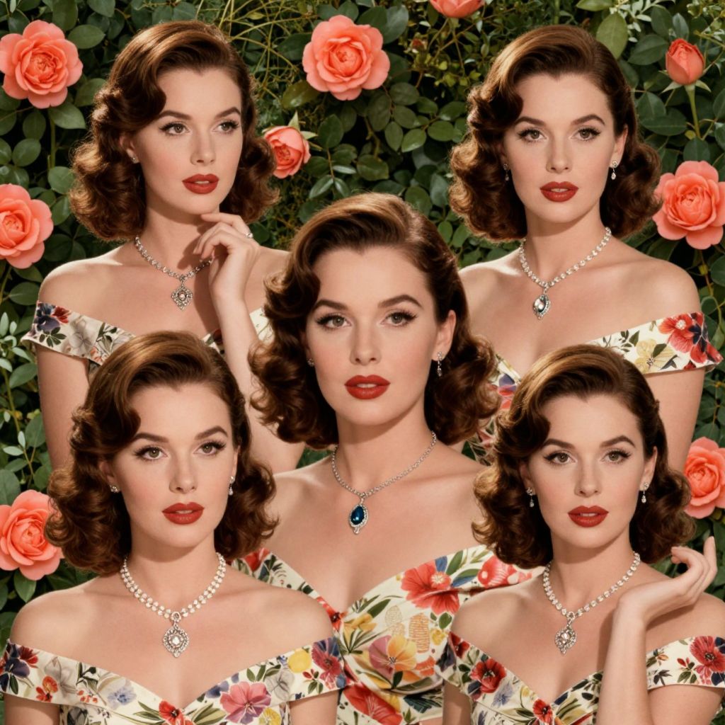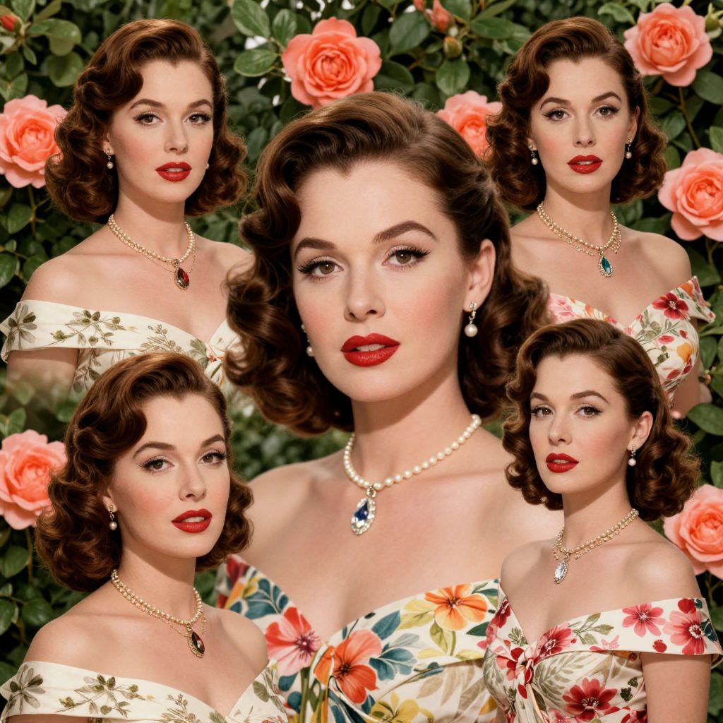 A vintage-inspired digital collage featuring a woman with classic Hollywood waves, adorned in a floral off-the-shoulder dress and elegant jewelry, set against a lush backdrop of coral roses and green foliage, evoking a retro aesthetic reminiscent of Eugenia Loli's style.