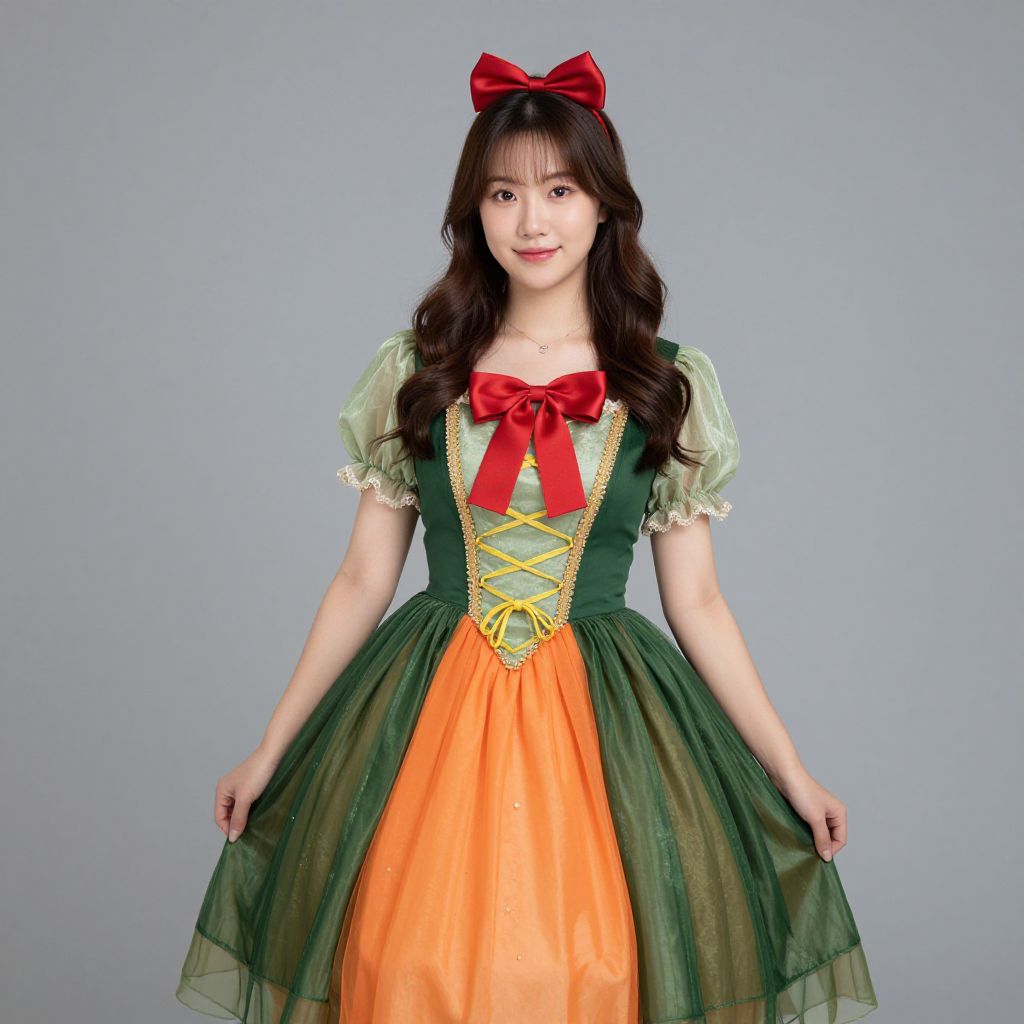 Asian woman in a green and orange Disney-inspired dress with a red bow, green puffed sleeves, and yellow lace-up bodice, smiling against a
