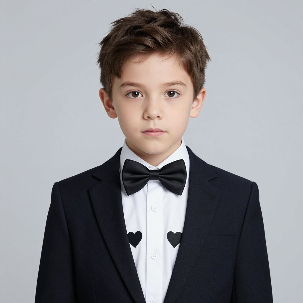 "ace spades costume kid, 1boy, male focus, solo, bow, bowtie, heart, shirt, white shirt, black bow, realistic, black bowtie, brown hair, looking at viewer, upper body, formal, closed mouth, grey background, suit, simple background Realistic photo of casual sexy person with pretty face"
