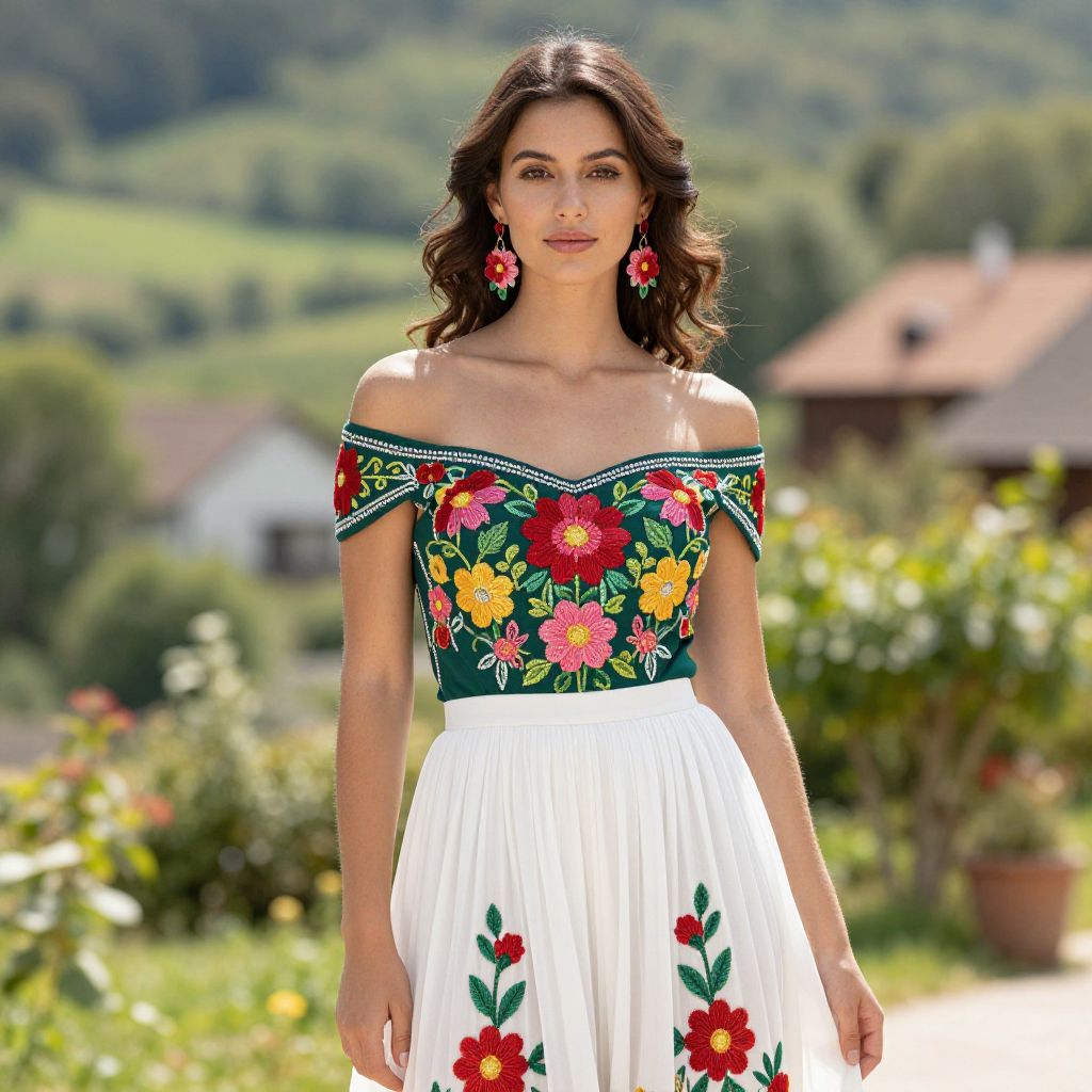 Portrait of a young woman with brown wavy hair wearing an off-the-shoulder, embroidered green bodice and a pleated white skirt with floral patterns. She stands outdoors on a sunny day in a picturesque village setting with lush greenery and blurred background. The dress features vibrant red, pink, yellow, and green flower embroidery. The woman accessorizes with matching flower-shaped earrings and displays a serene and elegant expression.