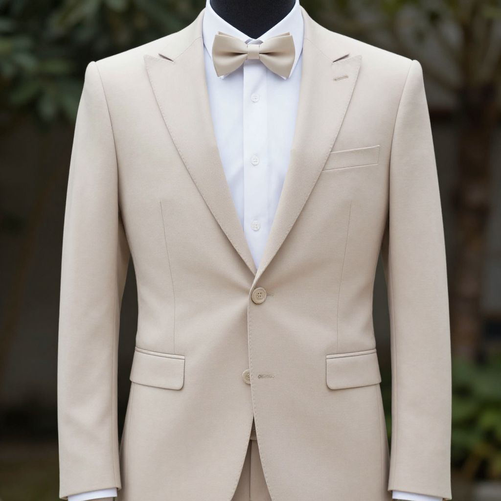 Photograph of a beige, single-breasted, tailored suit jacket with a notched lapel, worn over a white dress shirt with a beige bow tie. The jacket has two flap pockets and a single button closure. The background is blurred, featuring dark green foliage, suggesting an outdoor setting. The suit's fabric appears smooth and slightly glossy, and the overall style is formal and sophisticated. The mannequin's head is not visible, focusing attention on the suit's details.