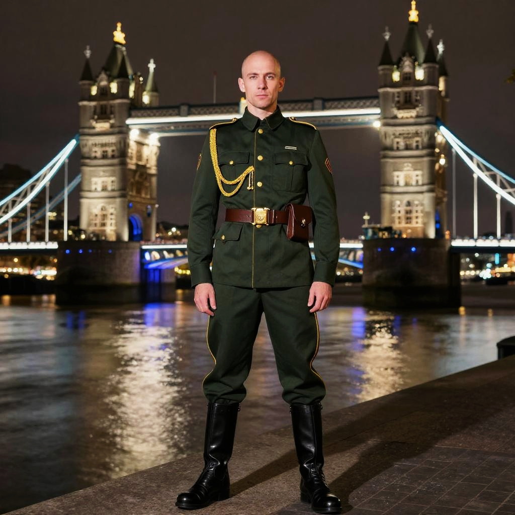 Photograph of a bald man standing confidently in front of the illuminated Tower Bridge at night. He's wearing a dark green military uniform with gold trim, black leather boots, and a brown belt with a pouch. The bridge's lights and reflections in the river create a dramatic background. He's centered in the frame, facing the camera with a serious expression.