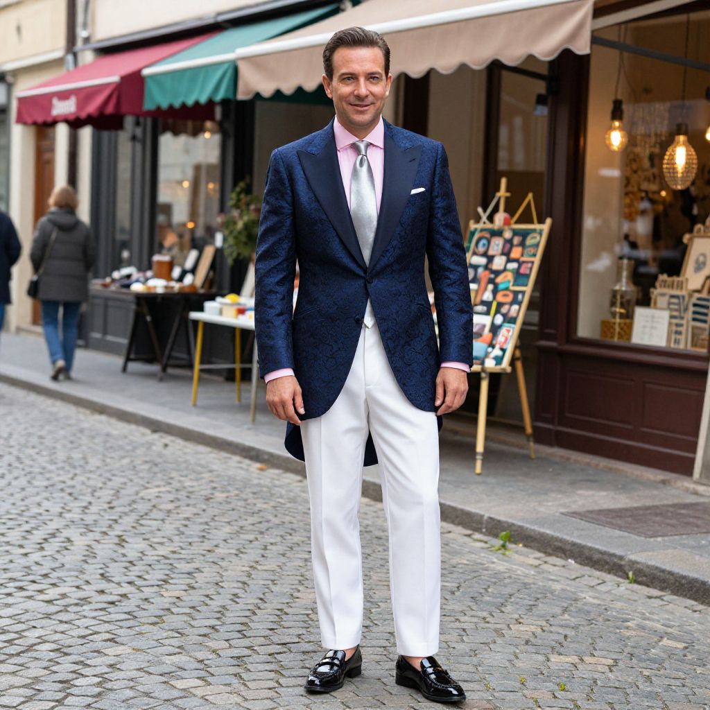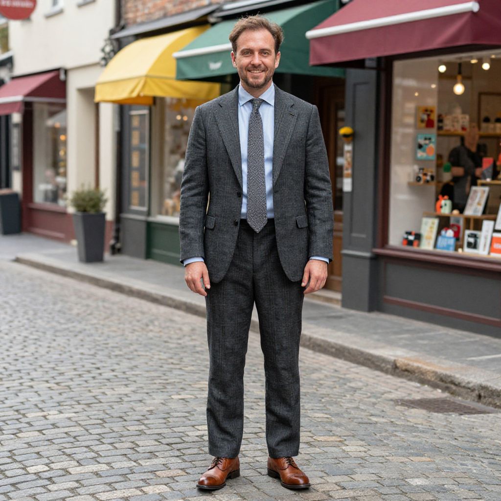 A man, charcoal gray plaid suit, breathable linen blend, pale blue dress shirt, textured gray tie, brown leather brogues, charming cobblestone street, colorful awnings fluttering, artisanal window displays, disposable camera style, relaxed smile, casual confidence. Man has masculine face and piercing eyes