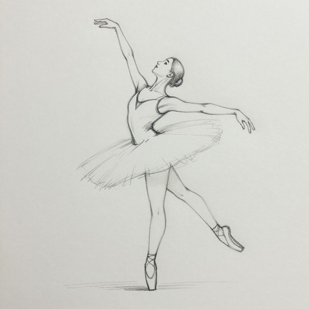 Art sketch ideas illustrating an elegant ballet dancer mid-pose, with fluid motion captured through graceful lines, delicate shading, and anatomical accuracy, emphasizing movement and emotion in a minimalist pencil sketch.