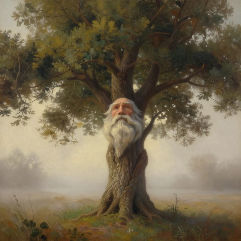 This is a digital painting depicting a whimsical scene of an old man with a long, white beard and kind eyes, partially hidden behind the trunk of a large, lush tree. The tree, with its broad canopy and detailed bark, stands in the center of a misty meadow, with soft, diffused light filtering through the fog in the background. The man's head and beard protrude from the trunk, giving the impression he is the tree's guardian. The colors are muted and earthy, with greens, browns, and whites dominating the palette. The style is realistic yet fantastical, evoking a sense of magic and nature.