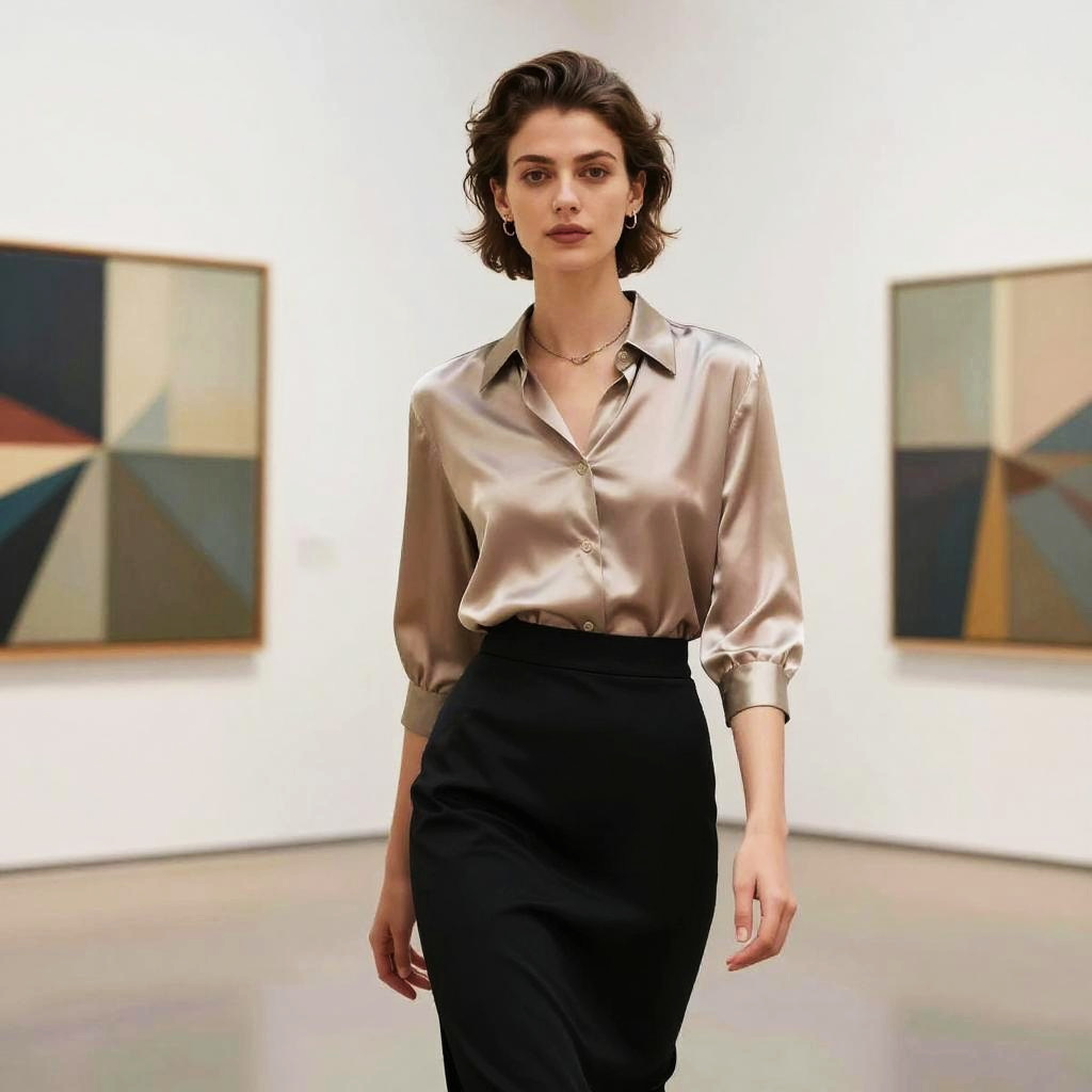Textured Pompadour hairstyle on male artist, wearing paint-splattered shirt, in urban mural wall, captured in fashion editorial style with natural morning light.