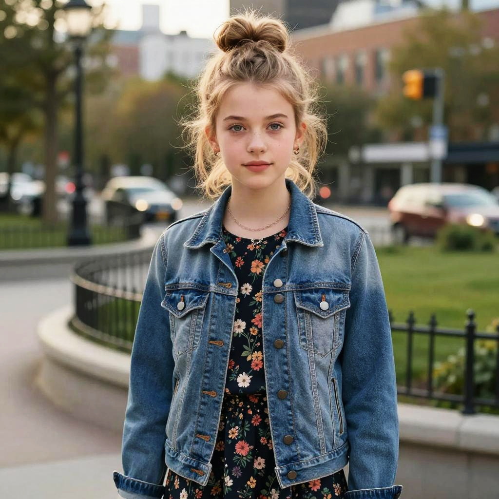 Photograph of a young Caucasian man with light skin and dark, styled hair. He has a serious expression and is wearing a light blue, denim button-up shirt adorned with colorful paint splatters on the chest and shoulders. The shirt has two chest pockets with black buttons. The background features abstract, colorful graffiti on a gray wall. The lighting is natural, highlighting his facial features and the texture of his shirt. The image has a slightly enhanced, vibrant color style.