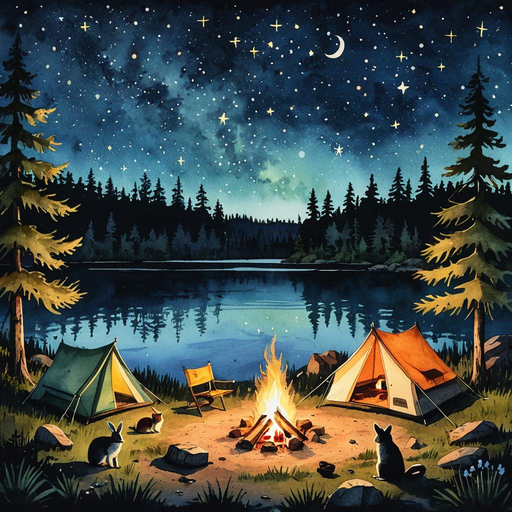 A idyllic lakeside campsite, featuring campfire glowing, small tents, and friendly woodland animals, set in a clear starry night sky, with serene and comforting vibes, illustrated in detailed watercolor artwork