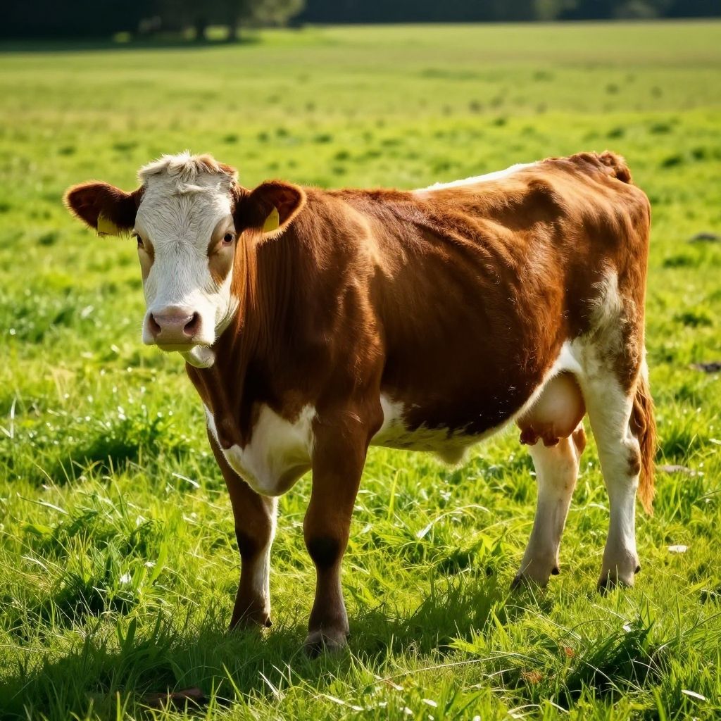 Biggest calfs standing proudly in a lush green meadow, sunlight casting long shadows, hyper-realistic details, vibrant colors, ultra-high resolution, cinematic atmosphere