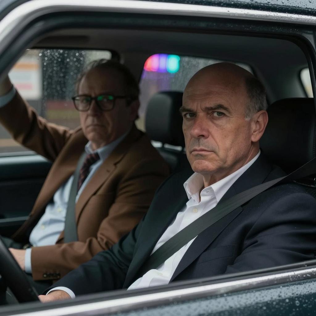 Two middle-aged men in a car. Foreground man with bald head, dark suit, white shirt, serious expression. Background man with receding hairline, glasses, brown suit, tie, focused expression. Rainy window with colorful neon lights. Foreground man leans forward, right arm raised. Both seated in driver and passenger seats. Dim, moody lighting.