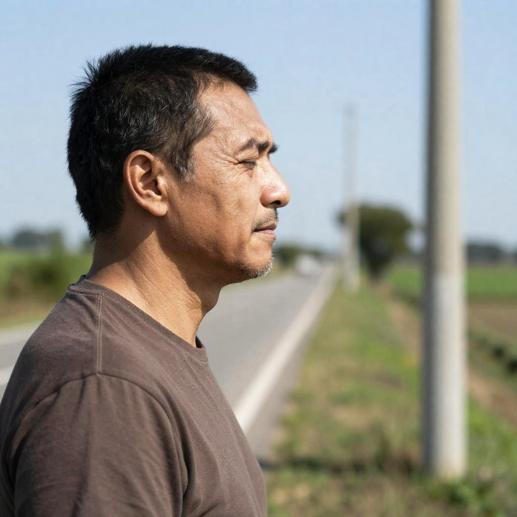 Photograph of two Asian adults. Foreground man with short black hair, mustache, maroon patterned shirt, slightly smiling. Background woman with black hair in ponytail, white polka-dotted shirt, arms crossed, neutral expression. Blue building and white building in background. Both standing outdoors near railroad tracks.