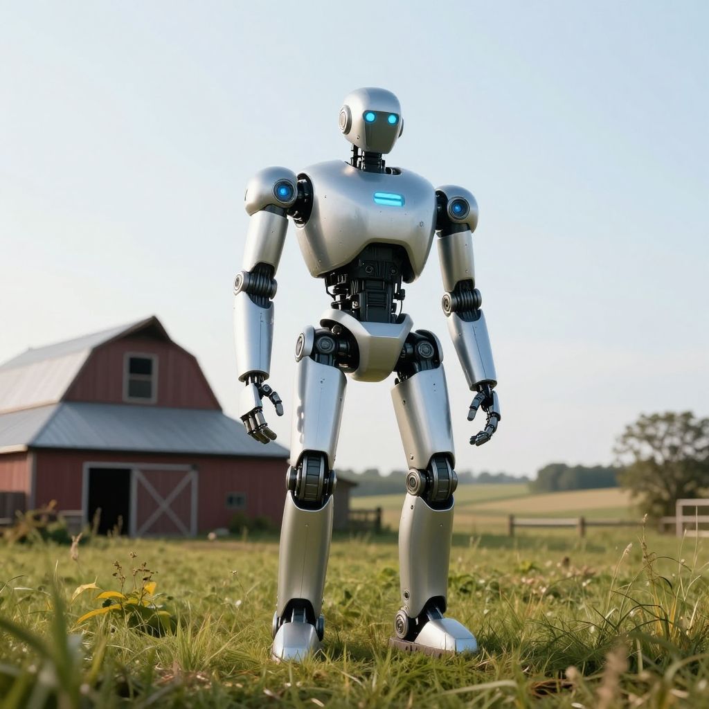 A photograph of a silver, humanoid robot standing in a grassy field. The robot has glowing blue eyes and light blue accents on its joints. It stands upright with a slightly forward stance, hands by its sides. In the background, there is a red barn with a white roof, set against a clear blue sky. The field is lush with green grass and scattered wildflowers. The robot's sleek, metallic texture contrasts with the rustic, rural setting. The image has a realistic style with sharp details and vibrant colors.