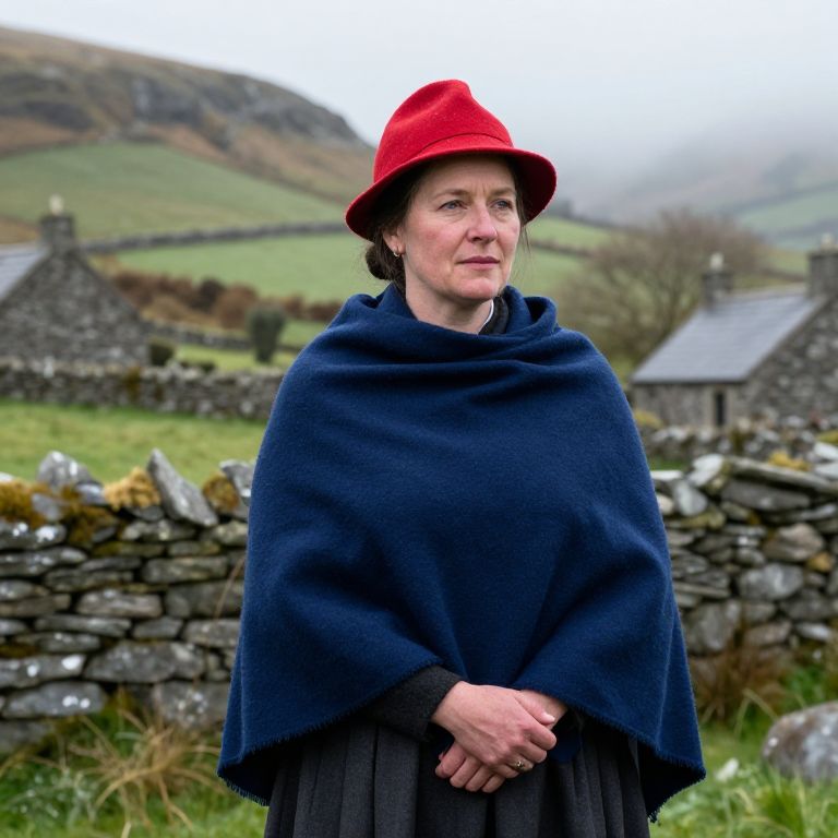 A realistic photograph of a Welsh traditional lady in her late 30s with fair, warm skin, kind eyes, and straight dark hair tied in a bun, wearing a bright red woolen hat and a flowing navy-blue shawl wrapped modestly around her shoulders, standing in a misty rural Welsh countryside at dawn, surrounded by stone cottages and rolling green hills, traditional woolen clothing and a rustic, earthy atmosphere.